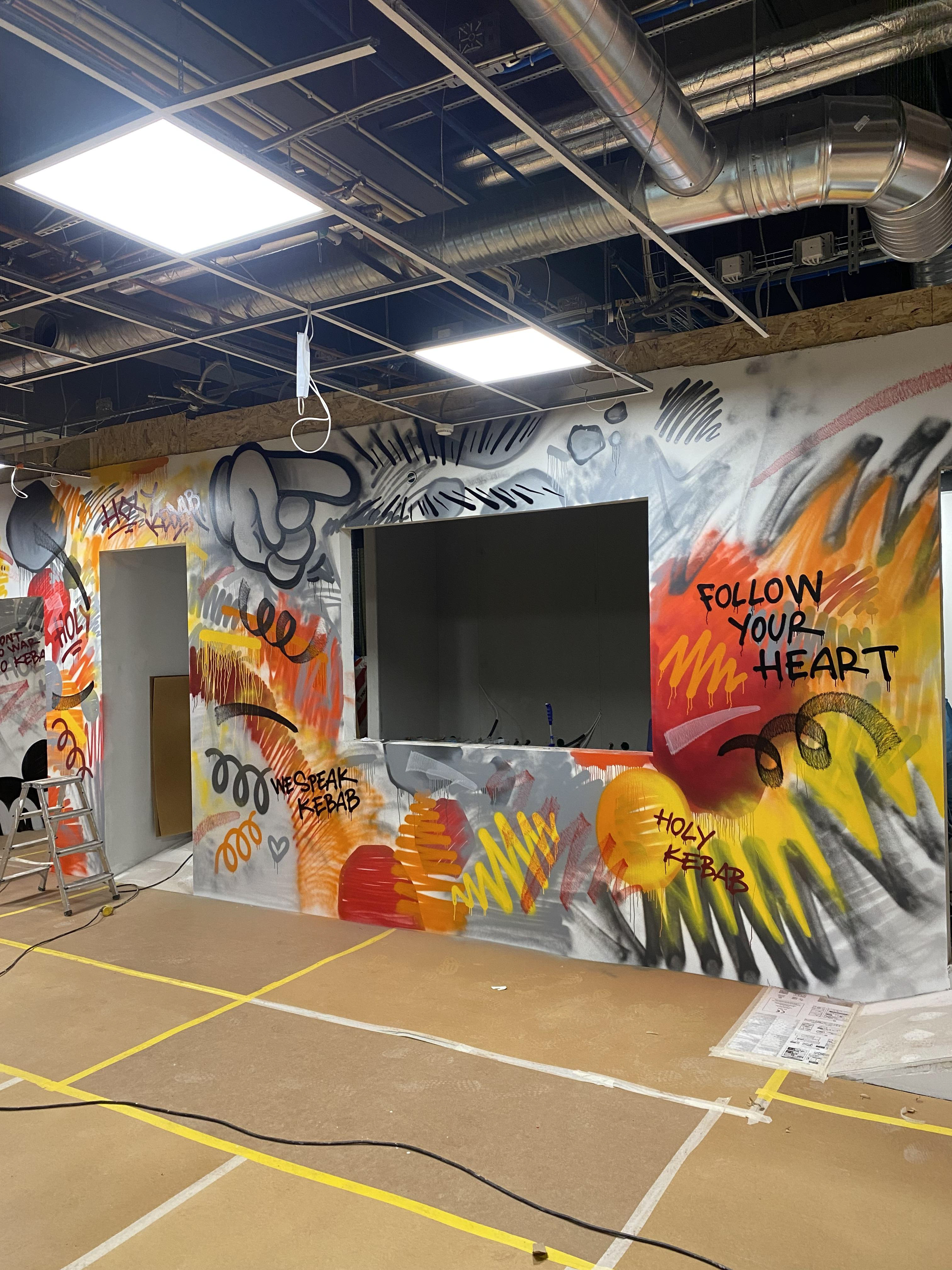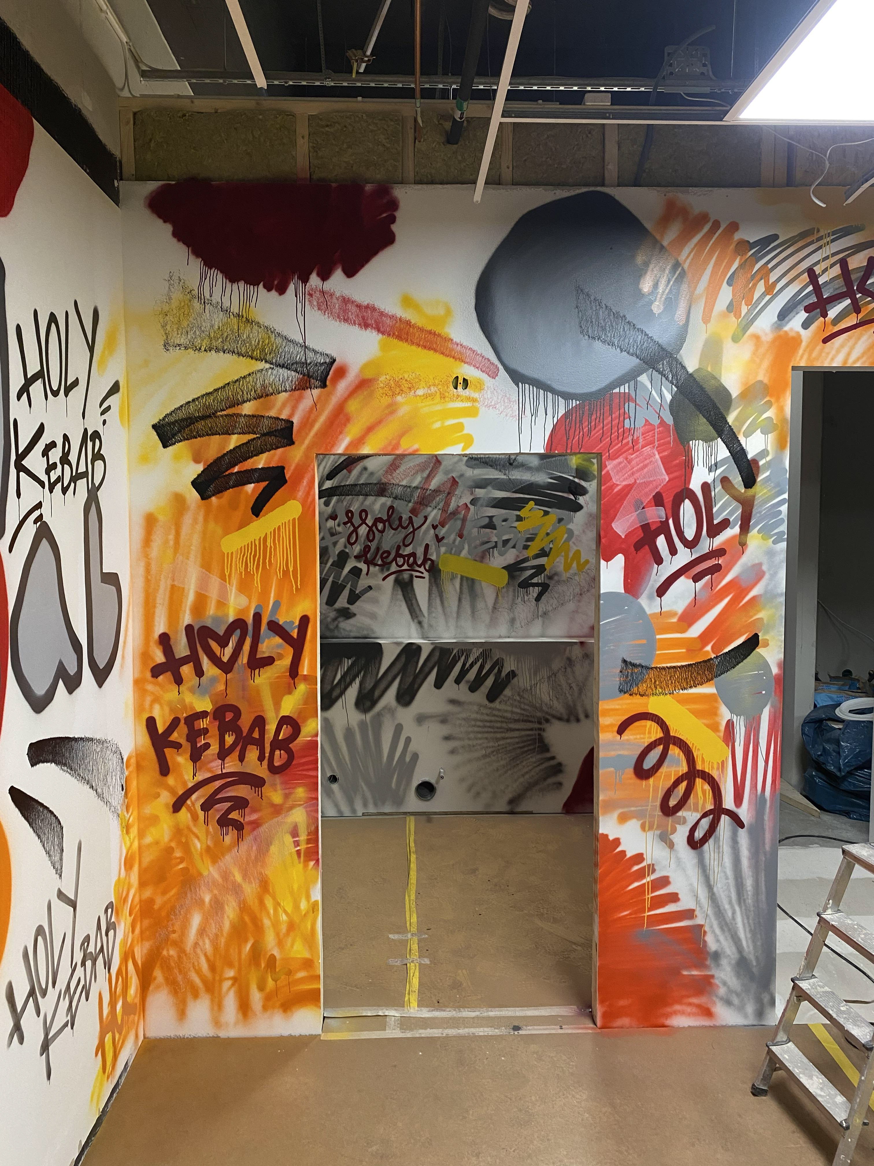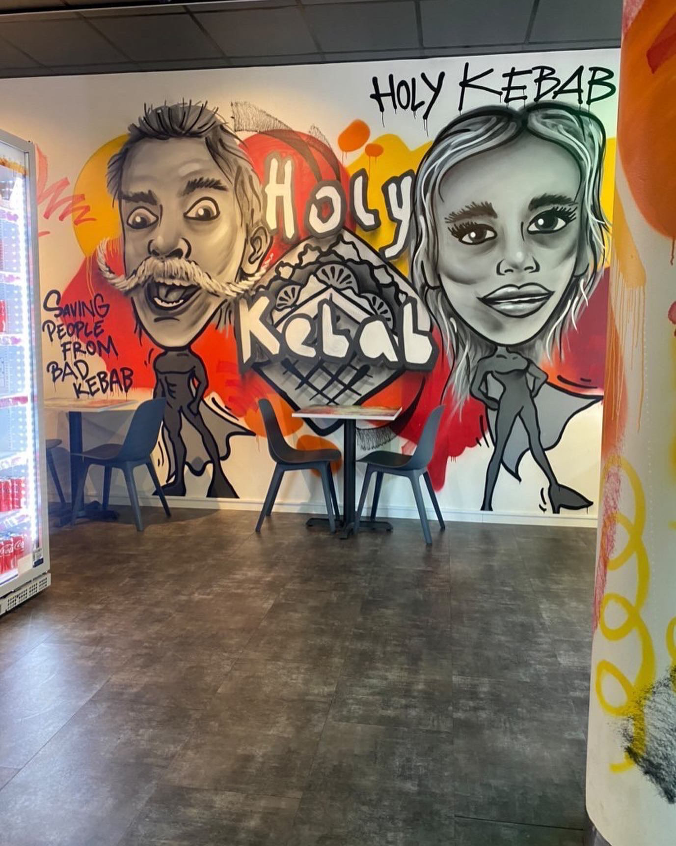 Målning på väggarna i restaurangen Holy Kebab i Skövde.