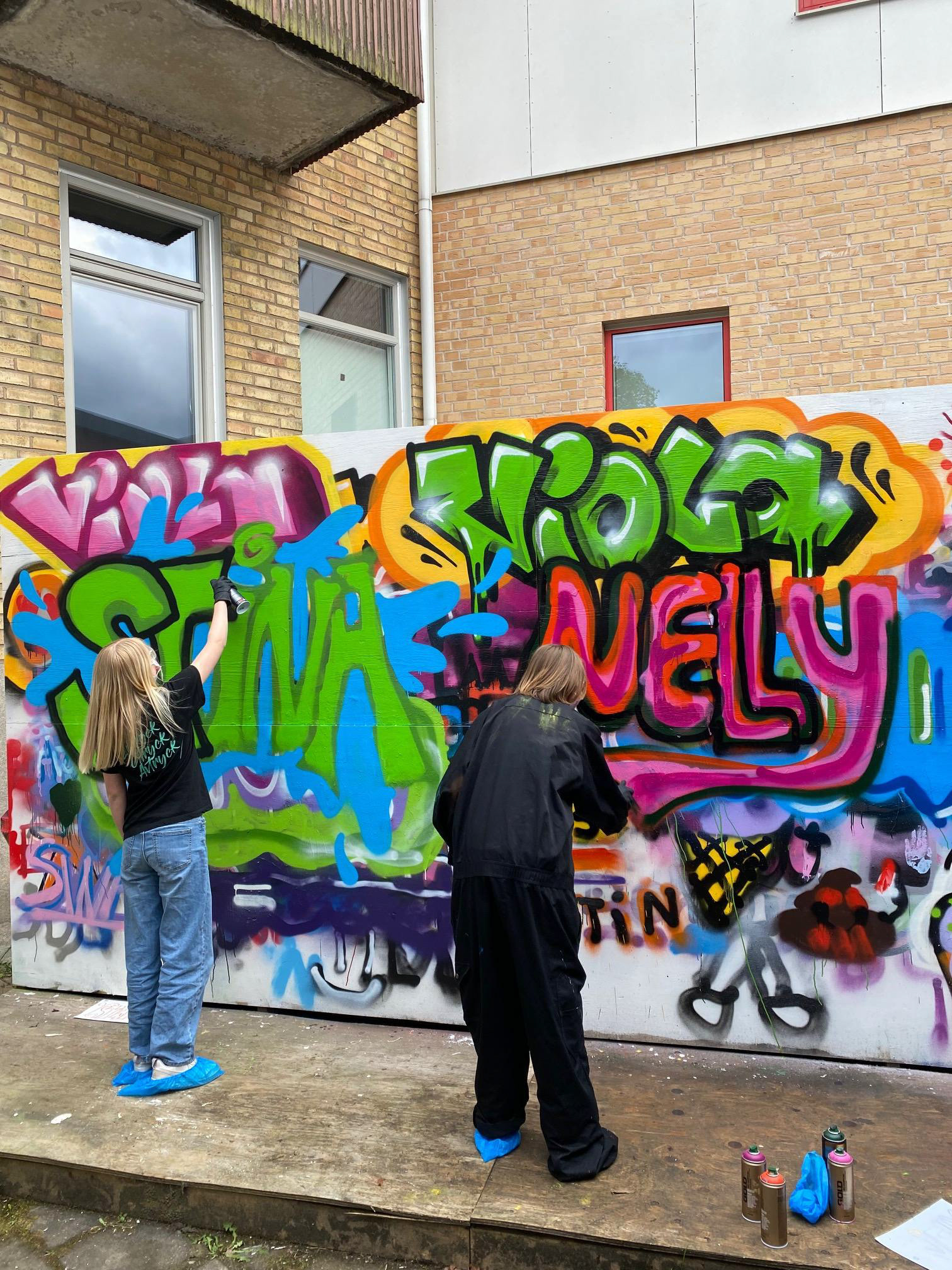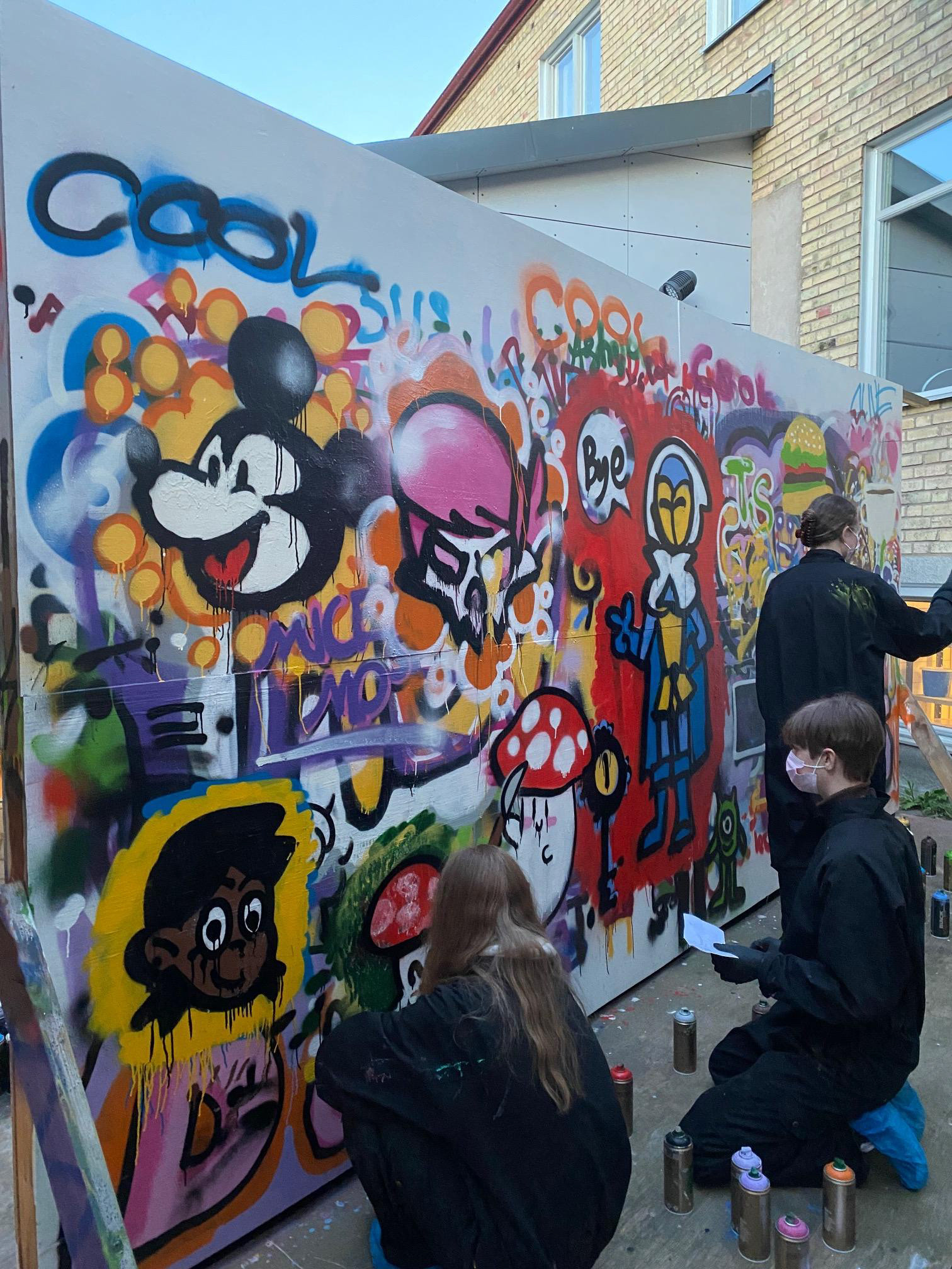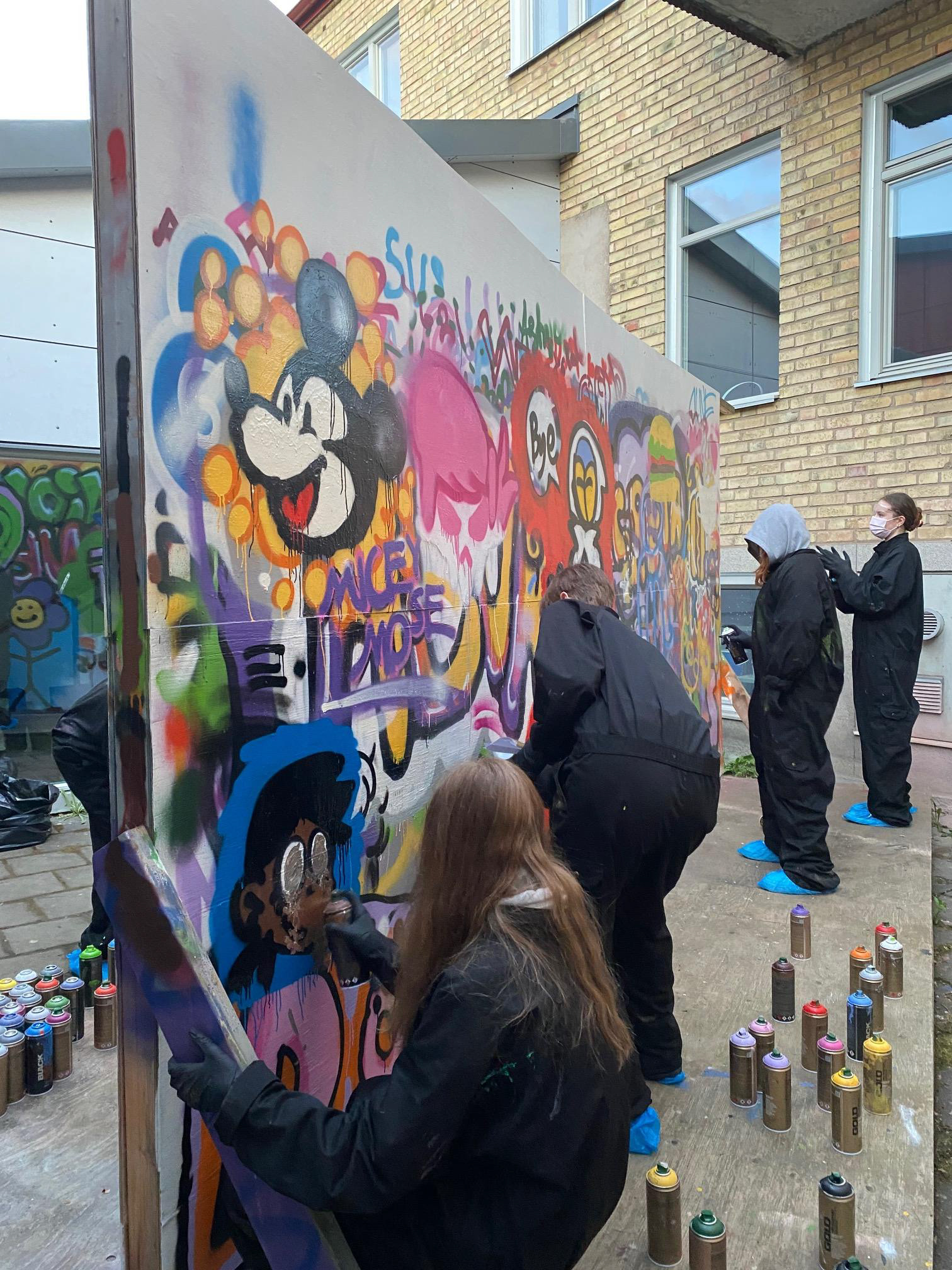 Bildlektioner i graffitins formsättning, med övning i skuggning och ljus m.m. Efter avslutad skiss fick alla deltagare måla med färg direkt på väggen.