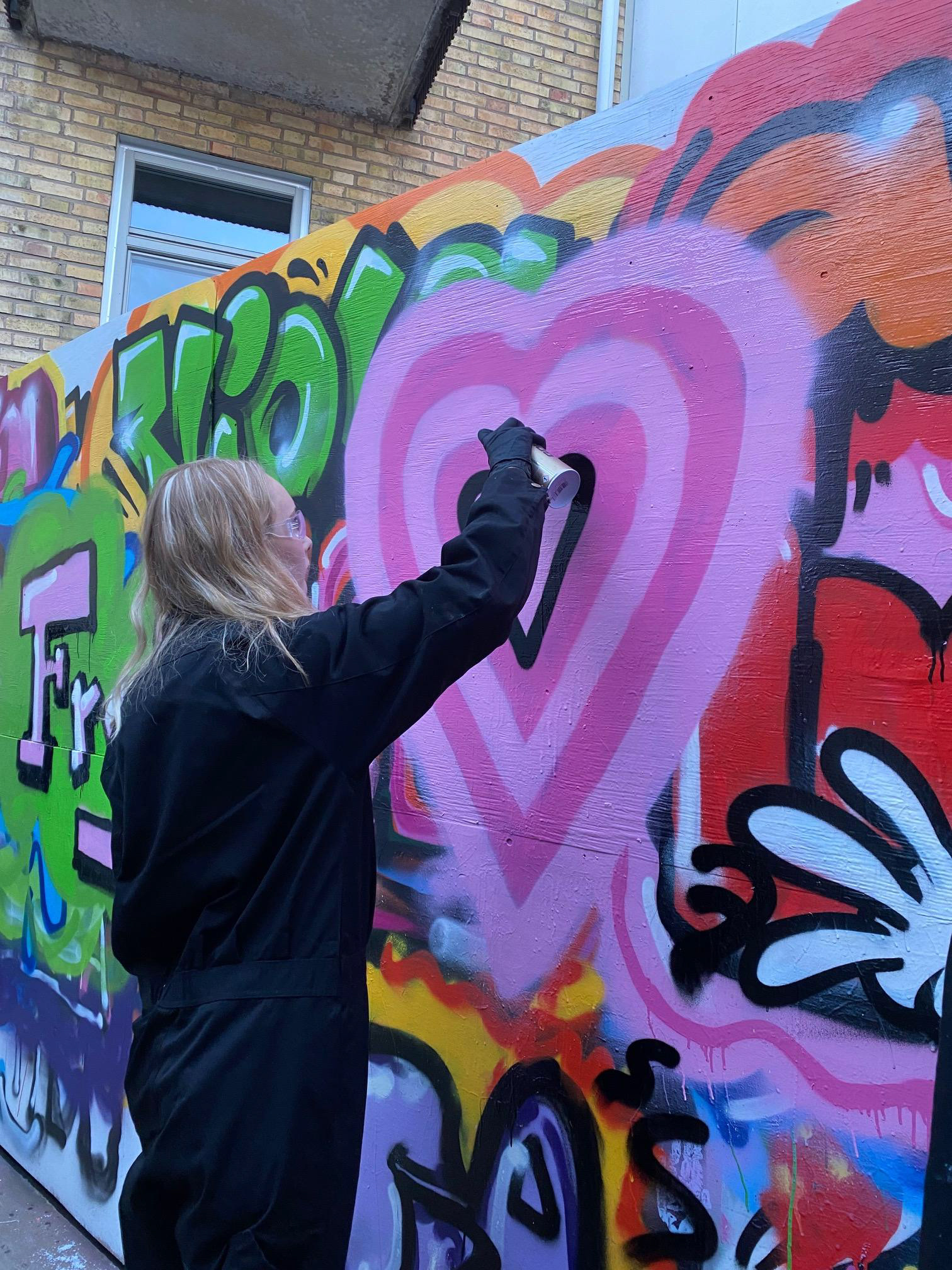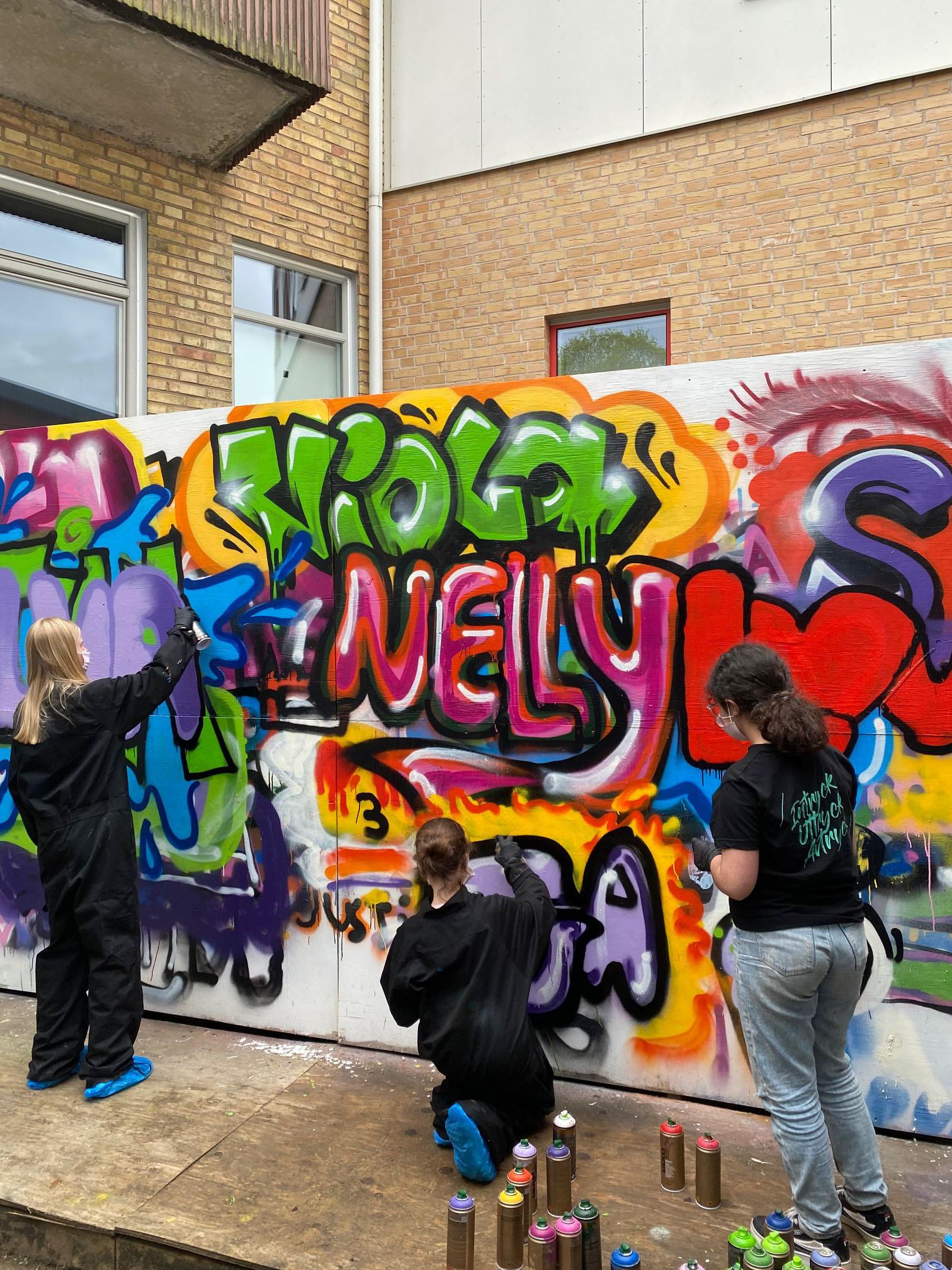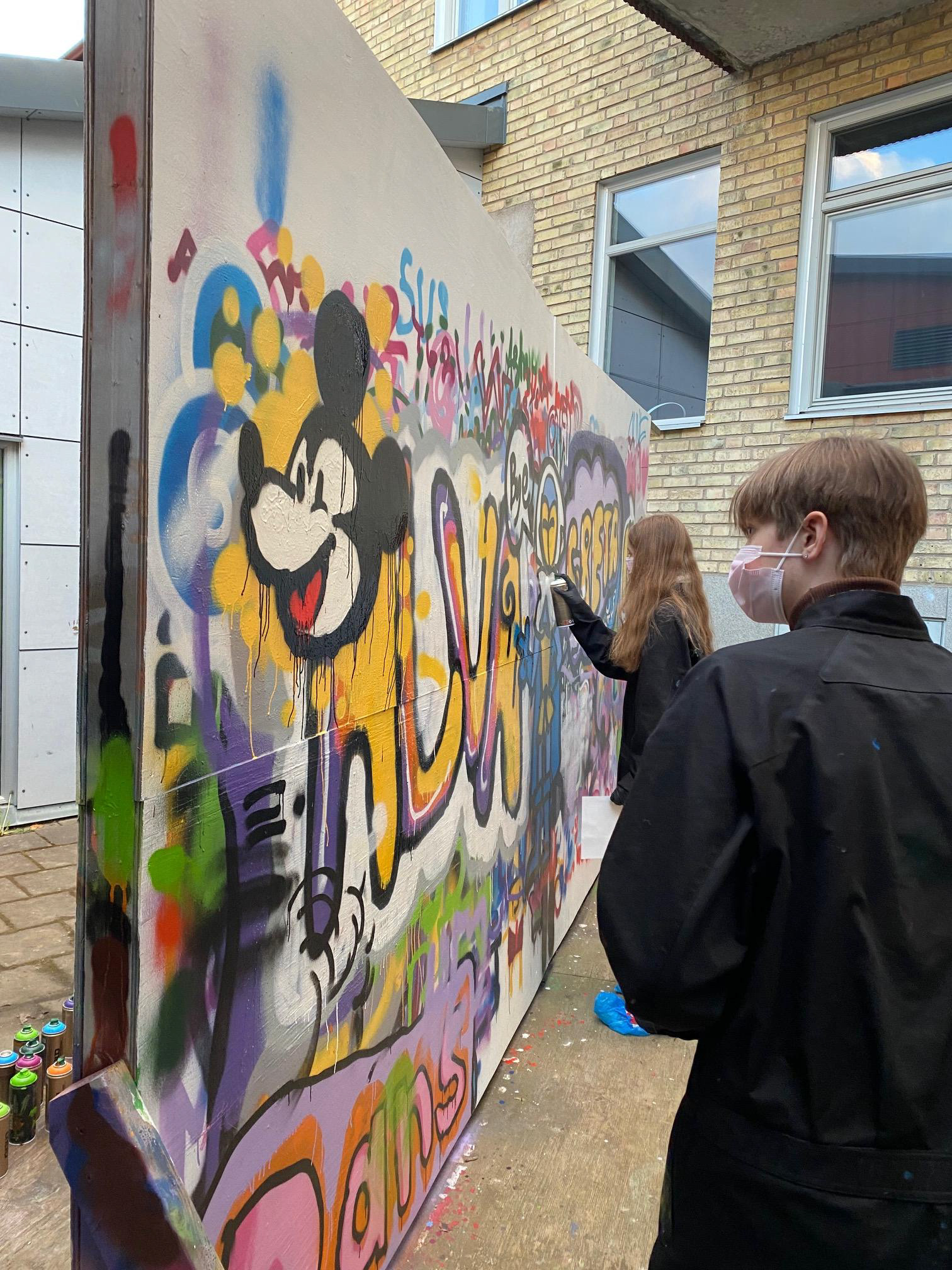 Bildlektioner i graffitins formsättning, med övning i skuggning och ljus m.m. Efter avslutad skiss fick alla deltagare måla med färg direkt på väggen.