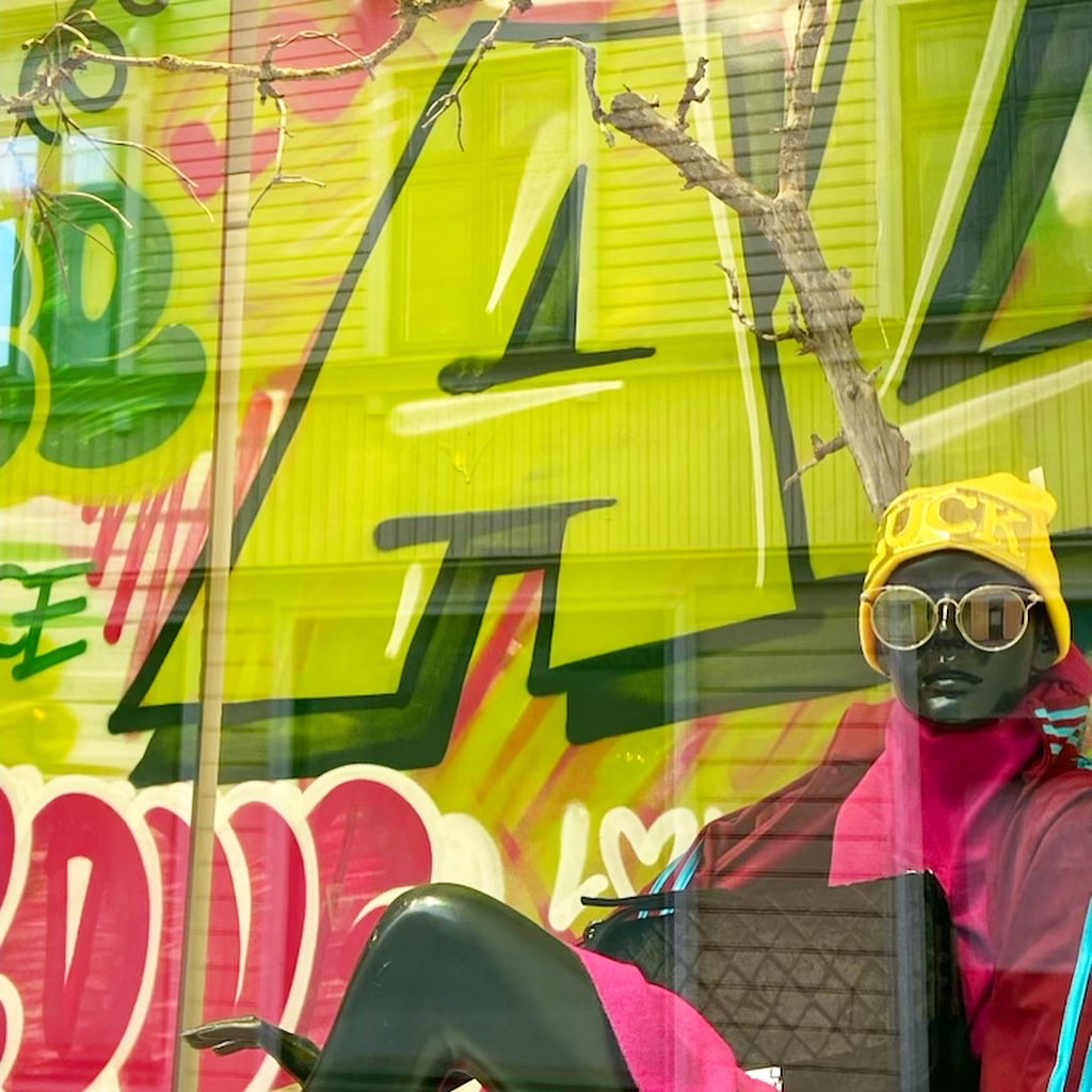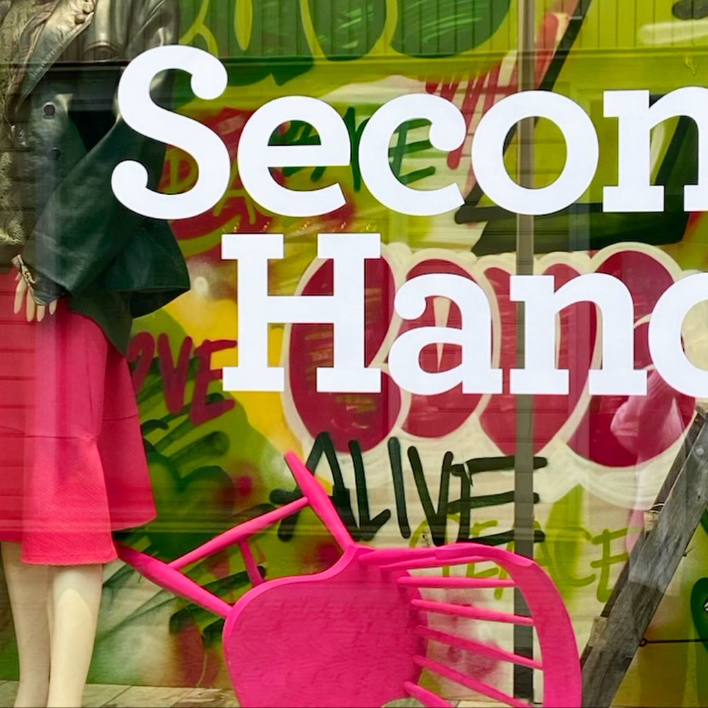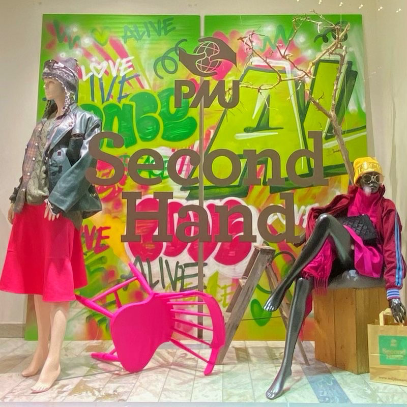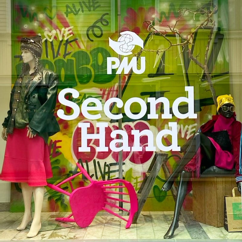 Målning till skyltfönster i Jönköping City, för PMU Second Hand.
