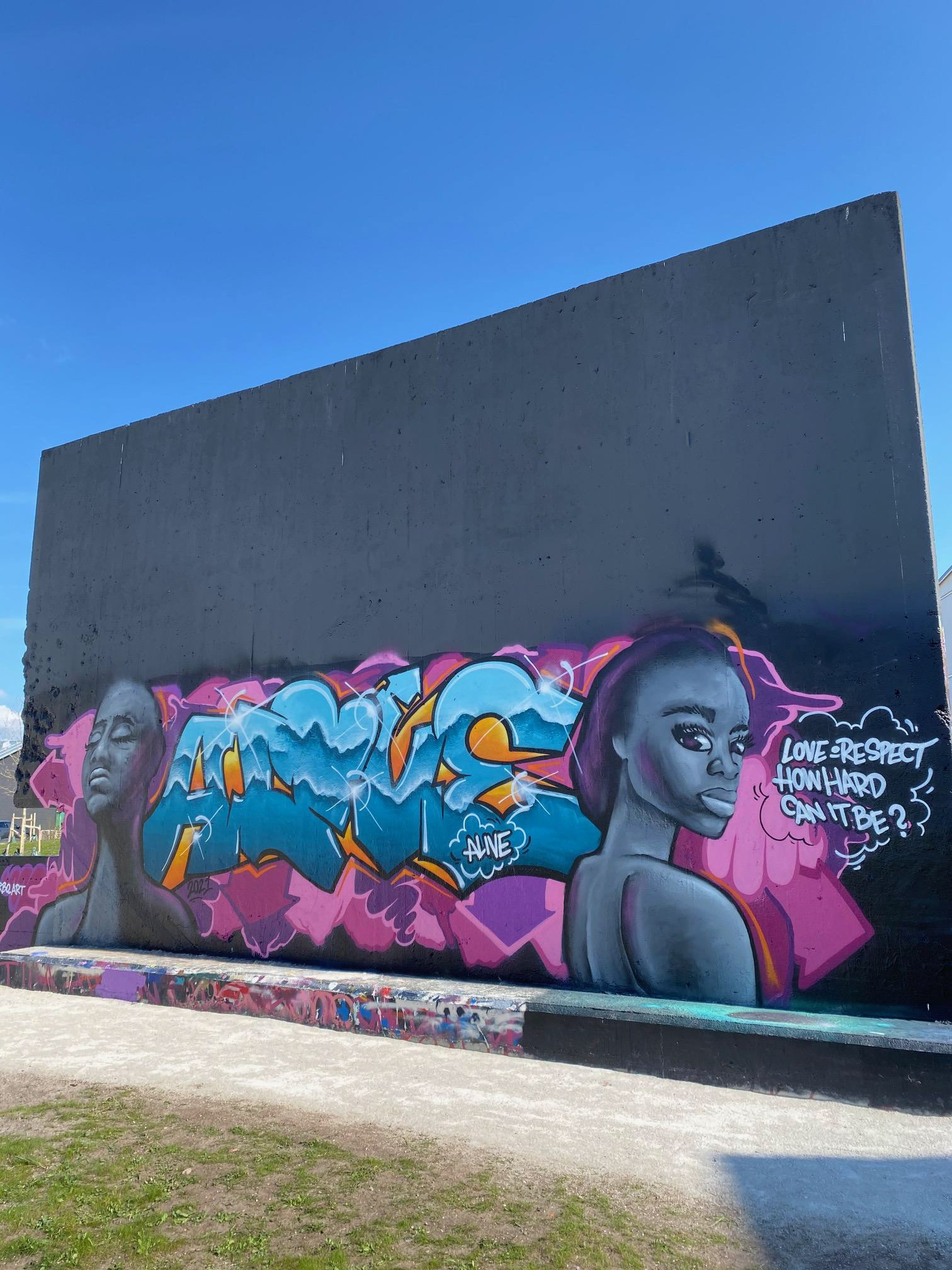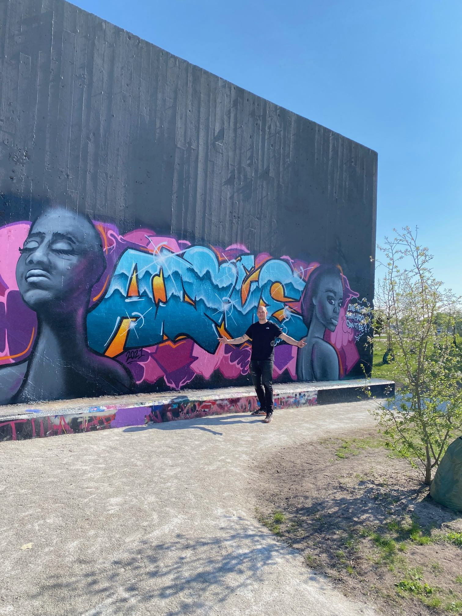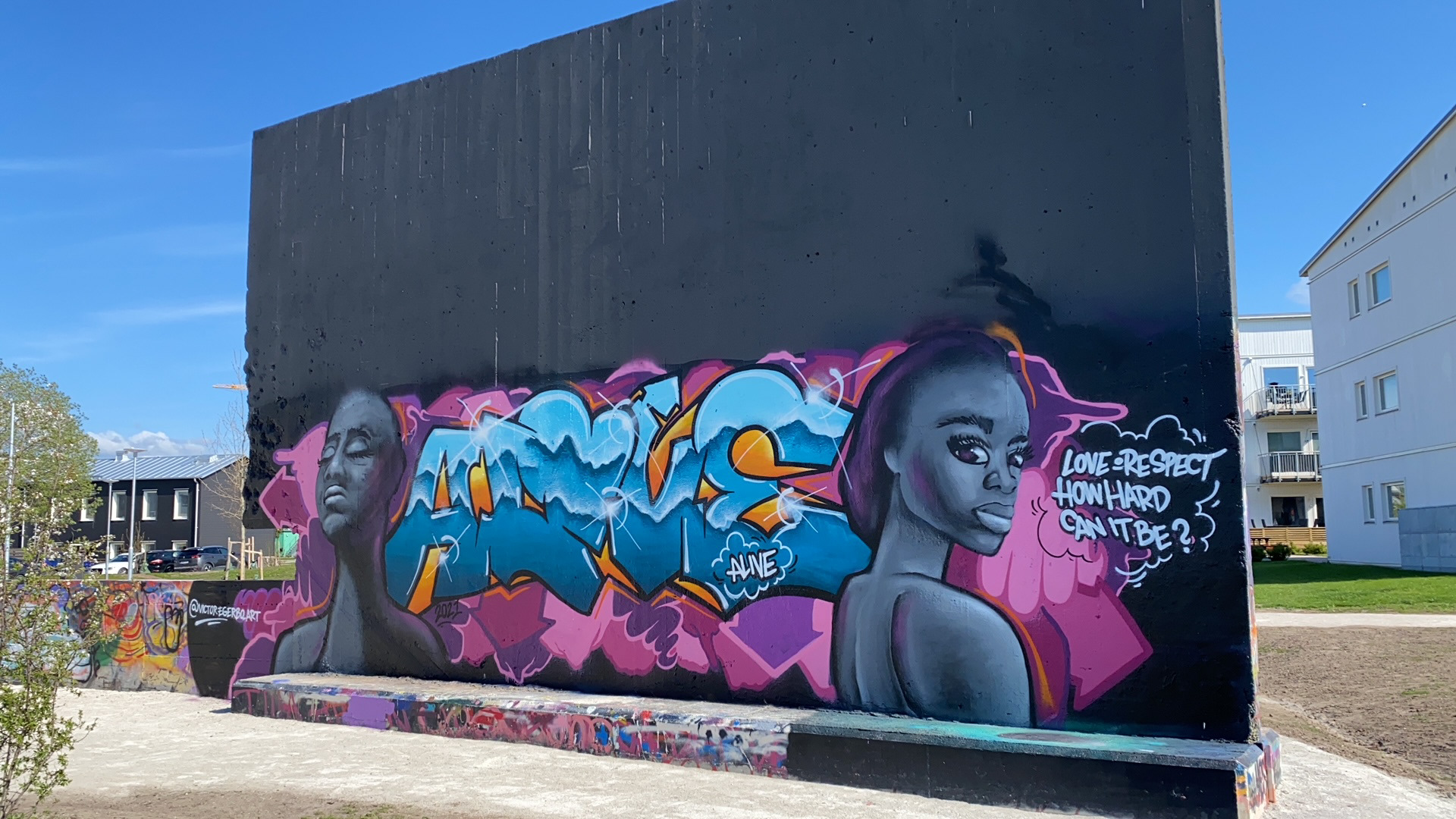 Stor muralmålning på öppna väggen i Visby, Gotland.